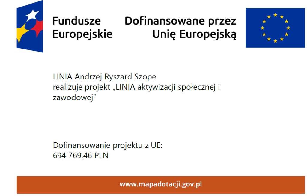 Z przyjemnością informuje, że nasz firma realizuje projekt pt. „LINIA aktywizacji społecznej i zawodowej” nr FEMA.08.01-IP.01-07S4/25. Projekt realizowany będzie w terminie od 01.01.2026r.-31.05.2027r., na obszarze objętym LSR LGD ,,Stowarzyszenie Społecznej Samopomocy”, czyli gm. Lipowiec Kościelny, Strzegowo, Szreńsk, Wiśniewo i Radzanów, znajdujące się w pow. mławskim. Projekt zakłada szeroką ofertę wsparcia dla osób biernych zawodowo oraz zagrożonych ubóstwem lub wykluczeniem społecznym przy zastosowaniu usług aktywnej integracji, tym m.in. wsparcie psychologiczne, doradztwo zawodowe, coaching i warsztaty kompetencji i umiejętności społecznych, szkolenia, staże, pośrednictwo pracy.